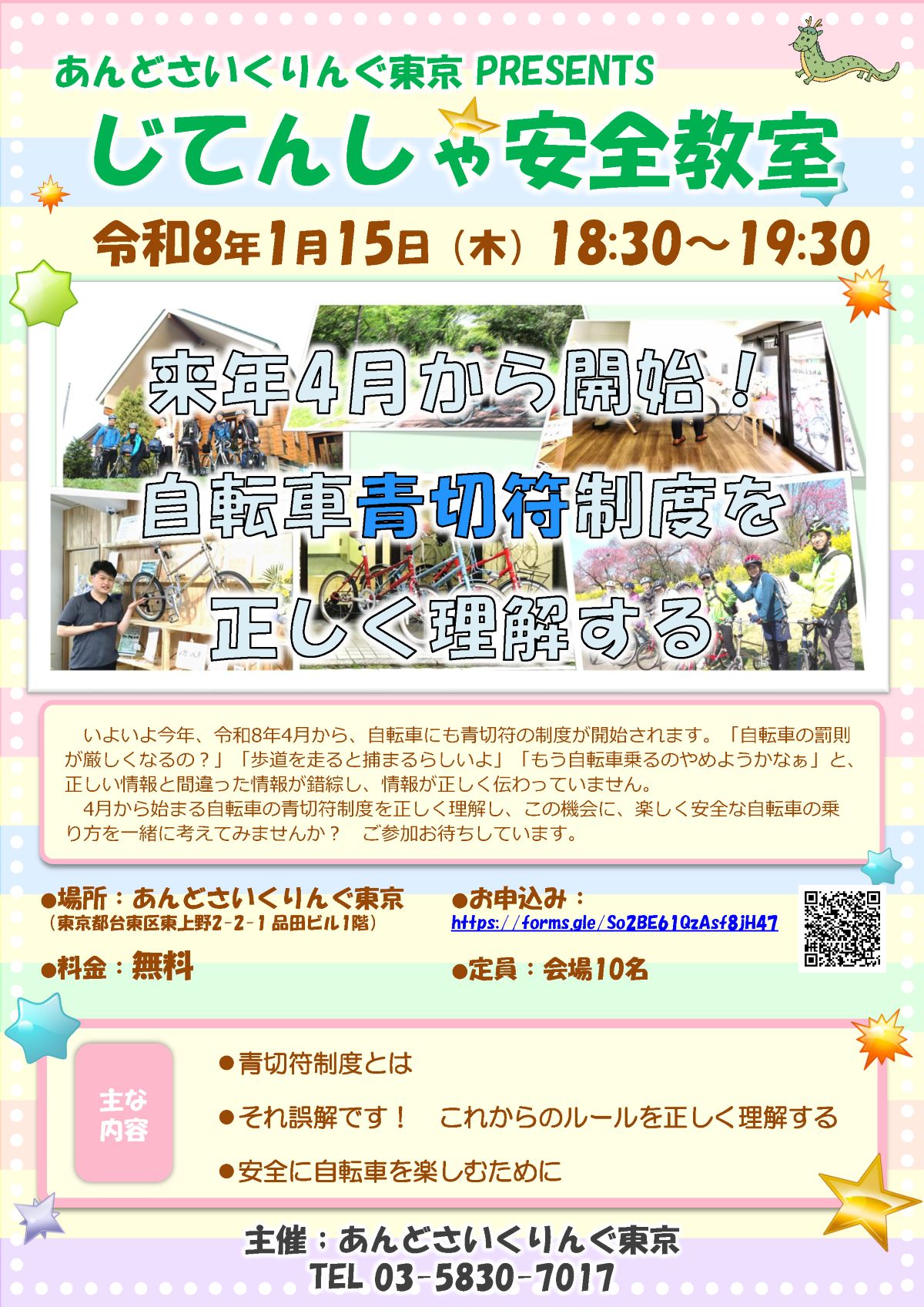 あんどさいくりんぐ東京では、自転車の乗り方教室や、交通安全教室、あるいはためになる自転車の話題など、「大人が通える あんどさいくりんぐ小楽校」の自転車教室として開催しています。